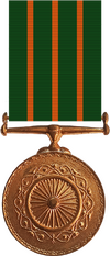 Medal: Circular bronze, 1-3/8 inches in diameter. In the centre, the Ashoka Chakra, surrounded by a lotus wreath and with an ornate edge. Suspended by a straight bar suspender. The medal is named on the edge.