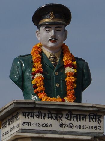 Major Shaitan Singh Bhati, PVC (1 December 1924 – 18 November 1962) was an officer in the Indian Army and a posthumous recipient of the Param Vir Chakra, India's highest military decoration for valour. Born in Jodhpur State, Singh joined the Indian army in 1949 and by 1962 had reached the rank of major. During the Battle of Rezang La in the 1962 Sino-Indian War, he commanded a company of the 13 Kumaon Regiment against a significantly larger Chinese force in Ladakh. Despite being outnumbered and under heavy fire, he moved between posts to organize the defence. For his actions, he was awarded the Param Vir Chakra posthumously.